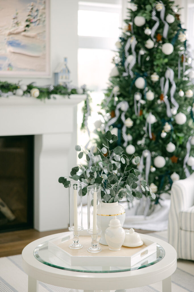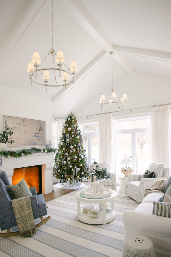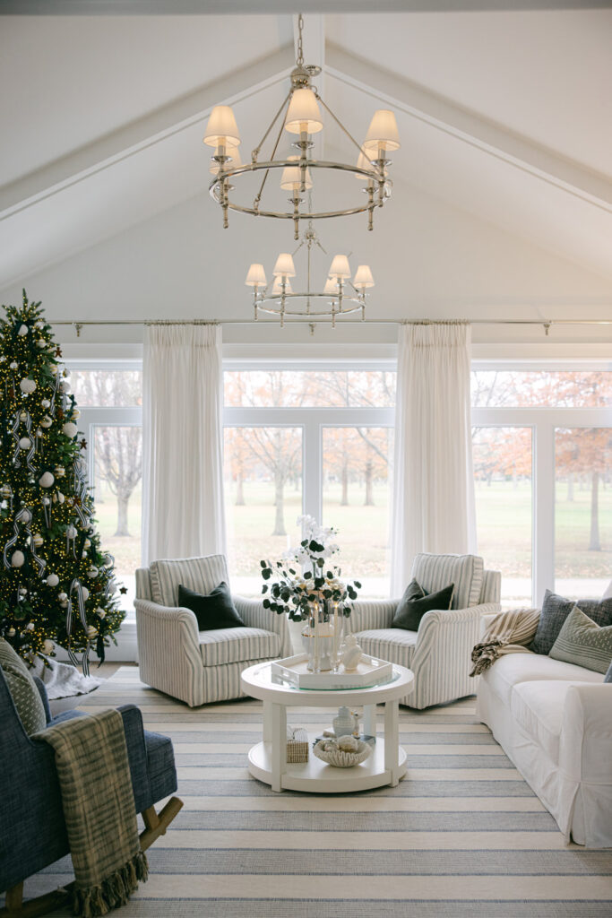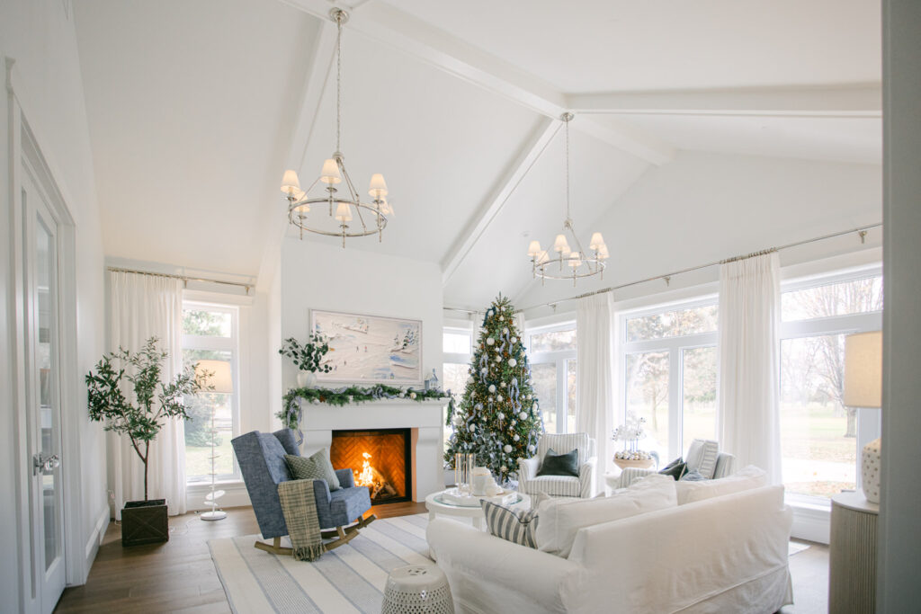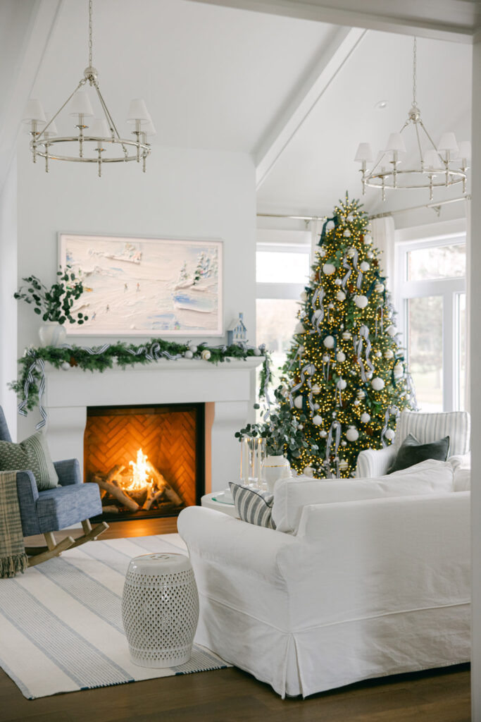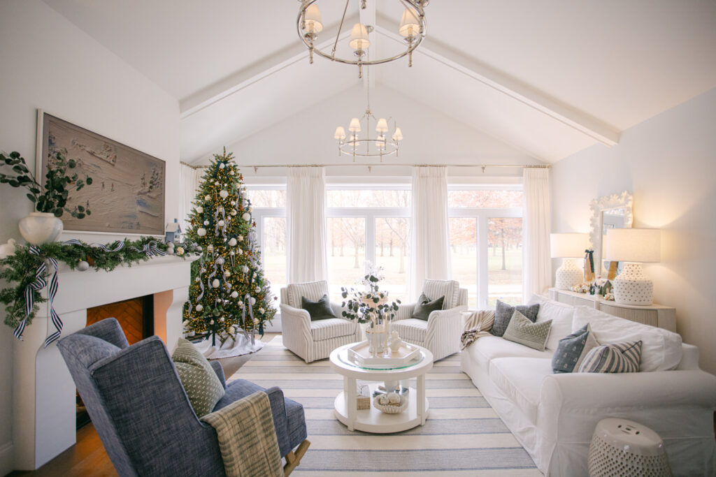 There’s something about decorating for Christmas in a bright, white, coastal home that feels especially magical. This is our first holiday season in the new house, and seeing this space filled with soft twinkle lights, layered ribbons, and greenery against the golf-course backdrop feels like everything I dreamed of when we renovated. I wanted this room to feel festive, but still very us — classic, calm, elegant, and Hamptons-inspired, with just a touch of whimsy.