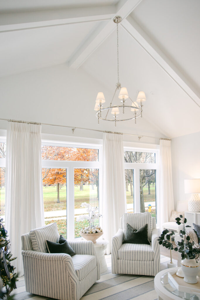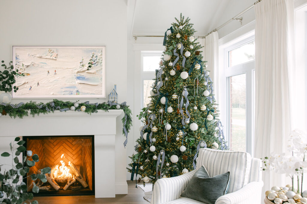 Soft blues, creamy whites, and classic stripes ground the room and make it feel collected, elegant, and incredibly comfortable. The striped chairs add just the right amount of pattern, the slipcovered sofa keeps everything airy, love the extra stripes in the rug, and all the greenery reflects so beautifully in the windows. With the fire on and the tree lit, this is truly the room where we gather and slow down.