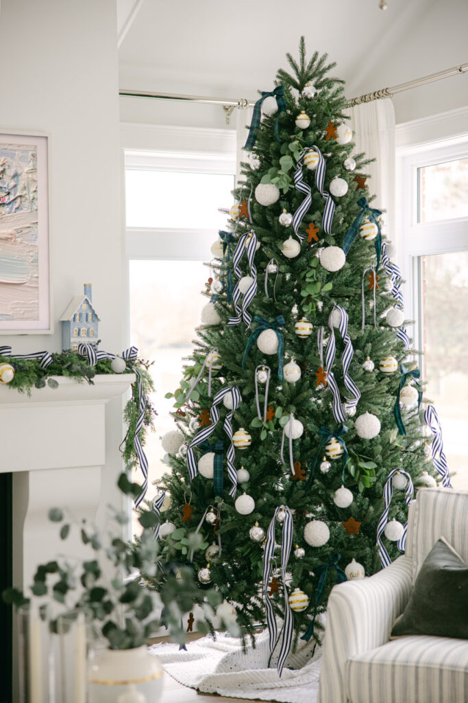 This year’s tree is full of texture and subtle personality: navy and white striped ribbon for that preppy coastal moment, blackwatch plaid ribbon to ground the palette, white textured ornaments that feel like snowballs, glass ornaments for sparkle, fresh greenery tucked into the branches for fullness, and homemade gingerbread cookie ornaments made by my mom — one of my favourite details because they bring warmth and nostalgia in the sweetest, most understated way.