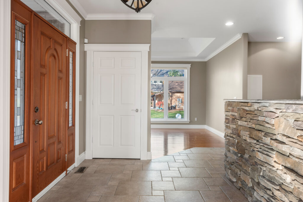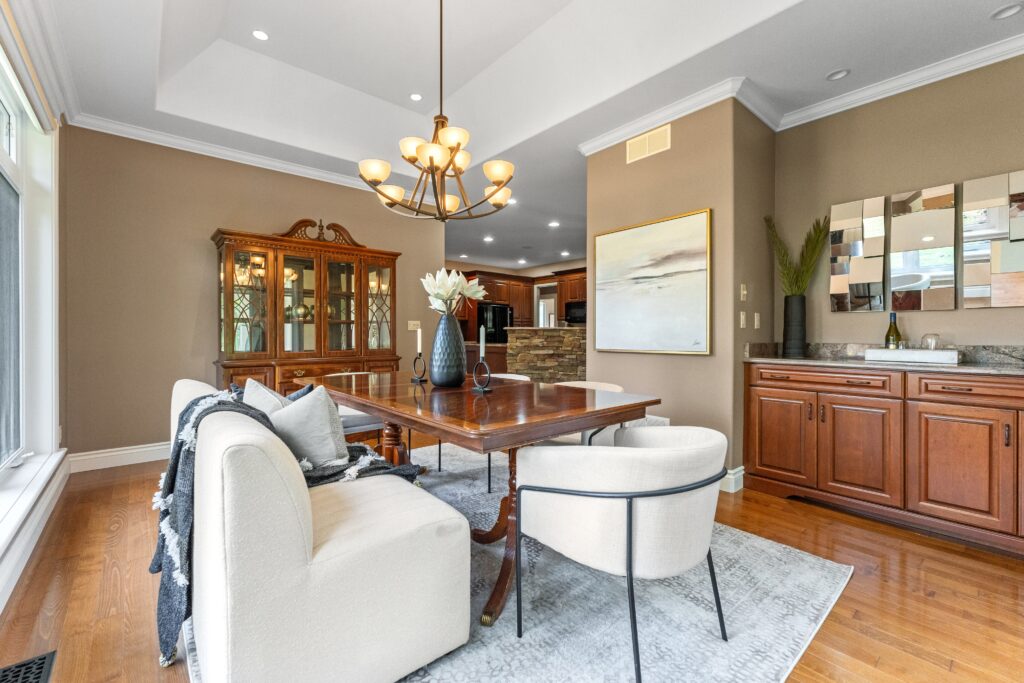 From there, we re-engineered the entire ceiling to create the vaulted peak you see now. I’ve always loved soaring ceilings, and this vault completely changed the feeling of the room — suddenly there was height, symmetry, and the perfect place for three polished nickel lanterns to live.