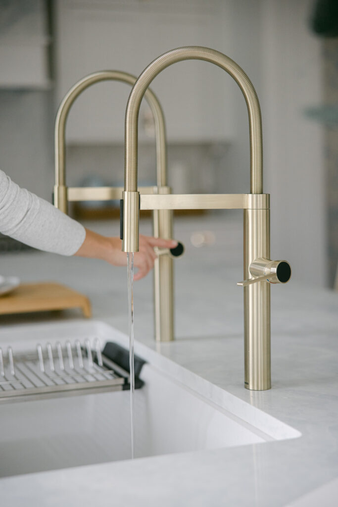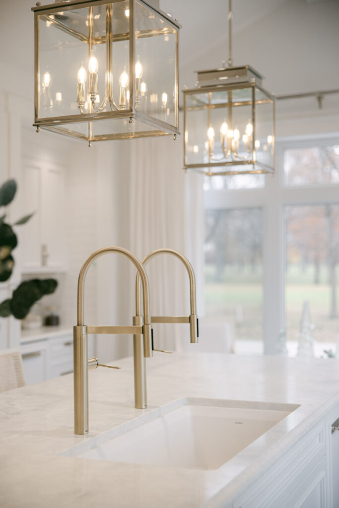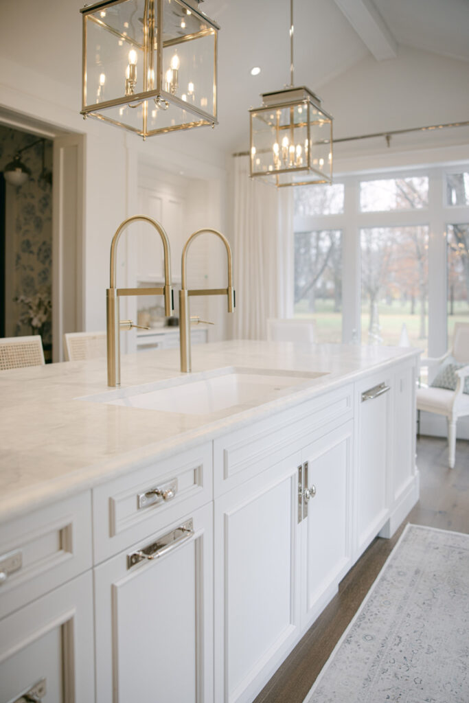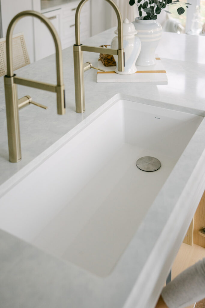 Because the sink is so wide I could do two faucets, which is such a high end and functional detail that allows two of us to be using the sink at once. So, if I’m doing the dishes, my husband can come over and fill a pot simultaneously, which gives us the functionality of an additional prep sink all in one. The tone is a soft, muted gold — not yellow — so it beautifully complements all the polished nickel in the room. A mixed-metal quiet luxury moment.