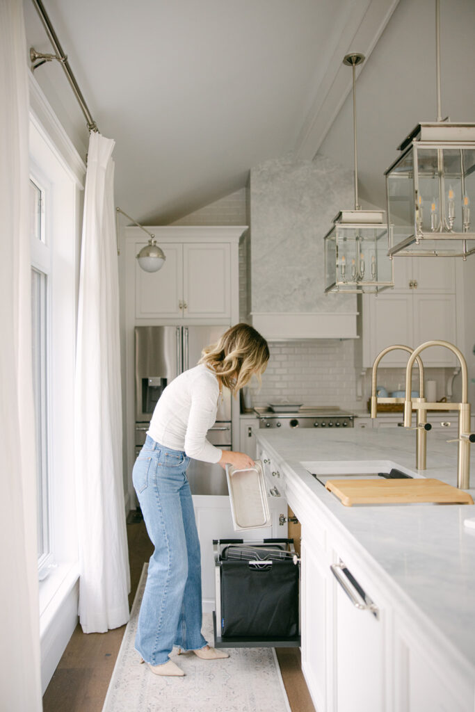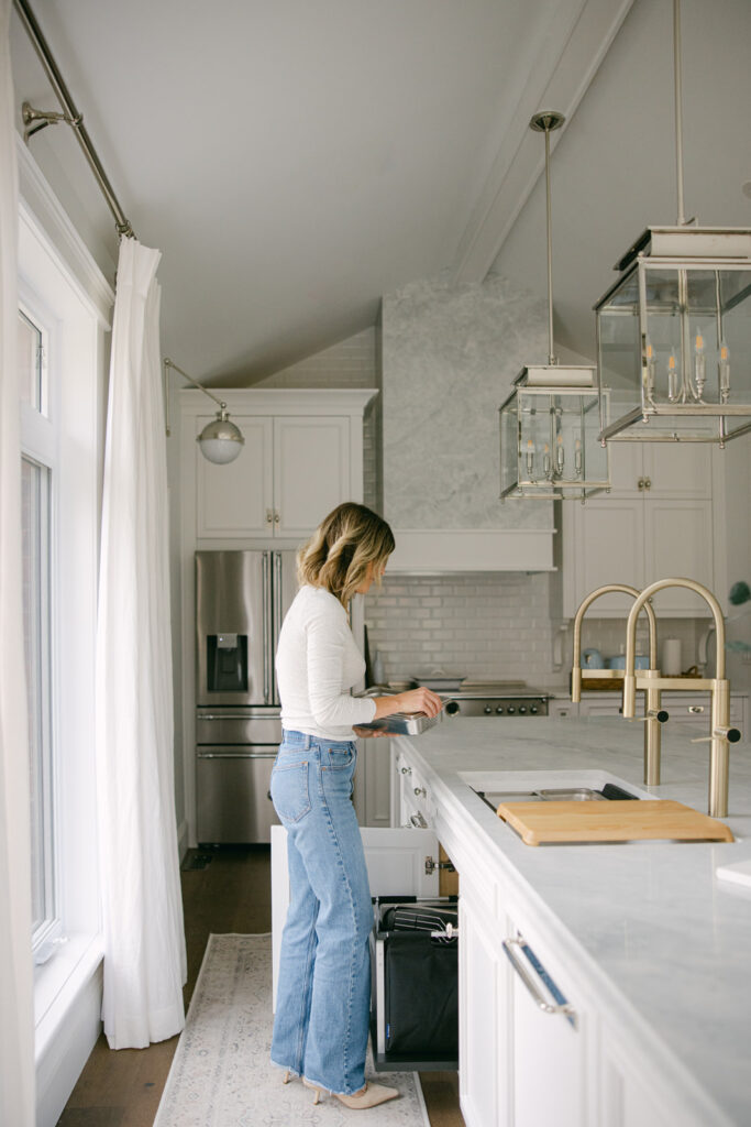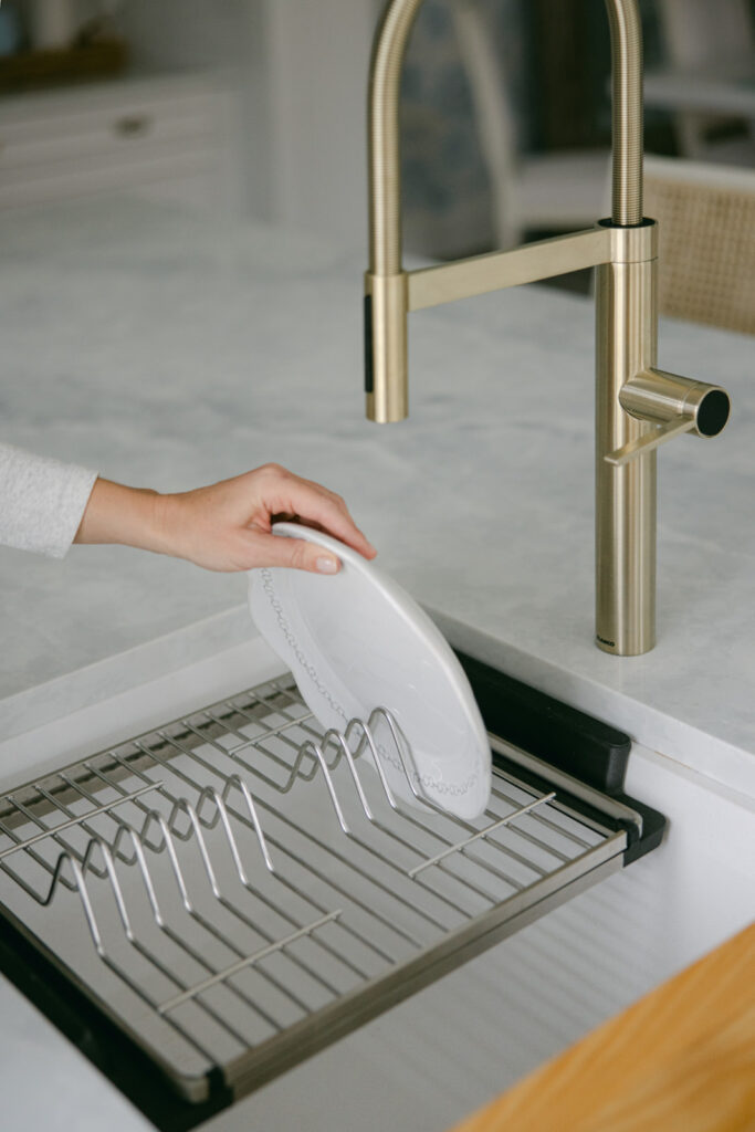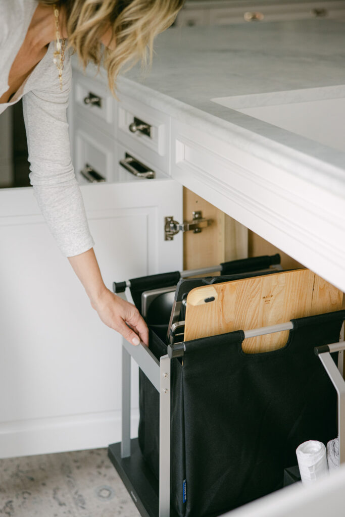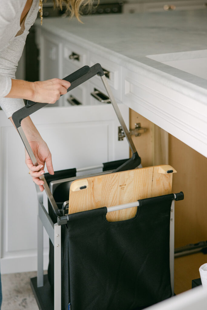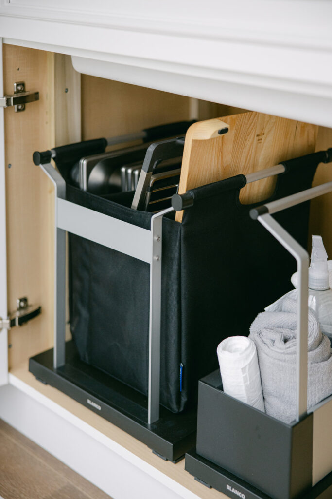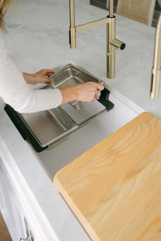 It’s a prep station, serving zone, and storage system in one. The accessories can sit neatly on the sink, by sliding to one side to save space, but can also store beautifully in the storage solution organizer bag under the cabinet (that pulls out like a drawer for easy access!). So, if you look under my sink, I have my cutting board, strainers, and oven-safe prep trays right under there for the easiest access. I also have a pull out cleaning caddy that you can pick up and bring where you need then set back down and store away under the sink.