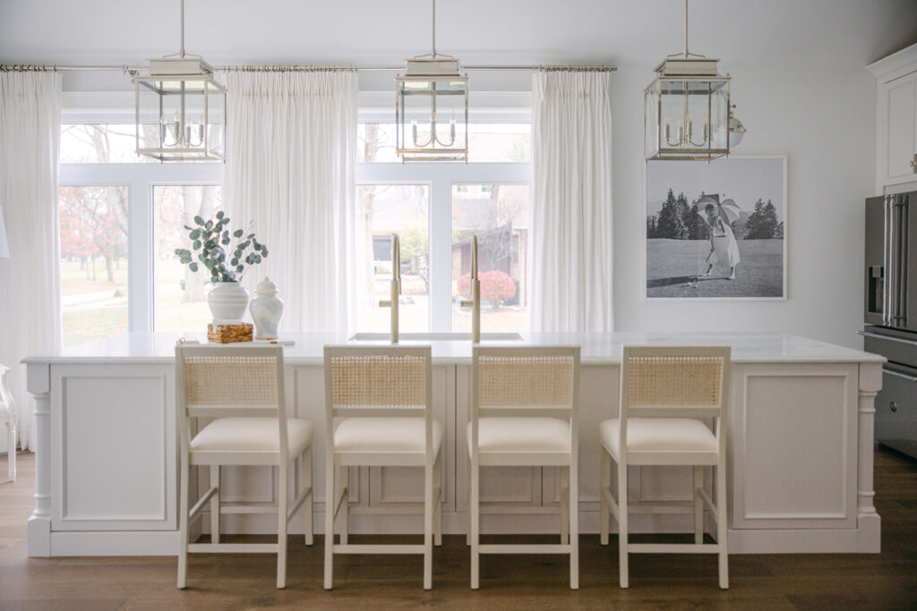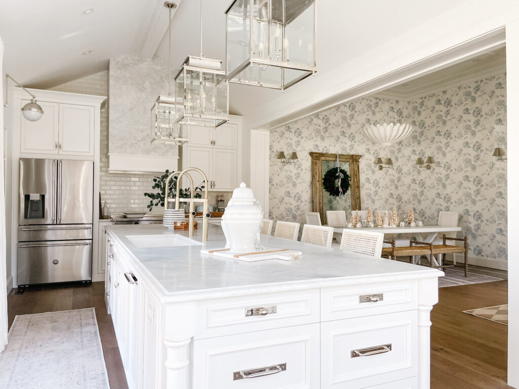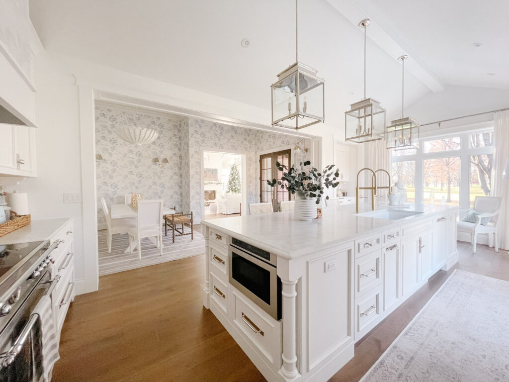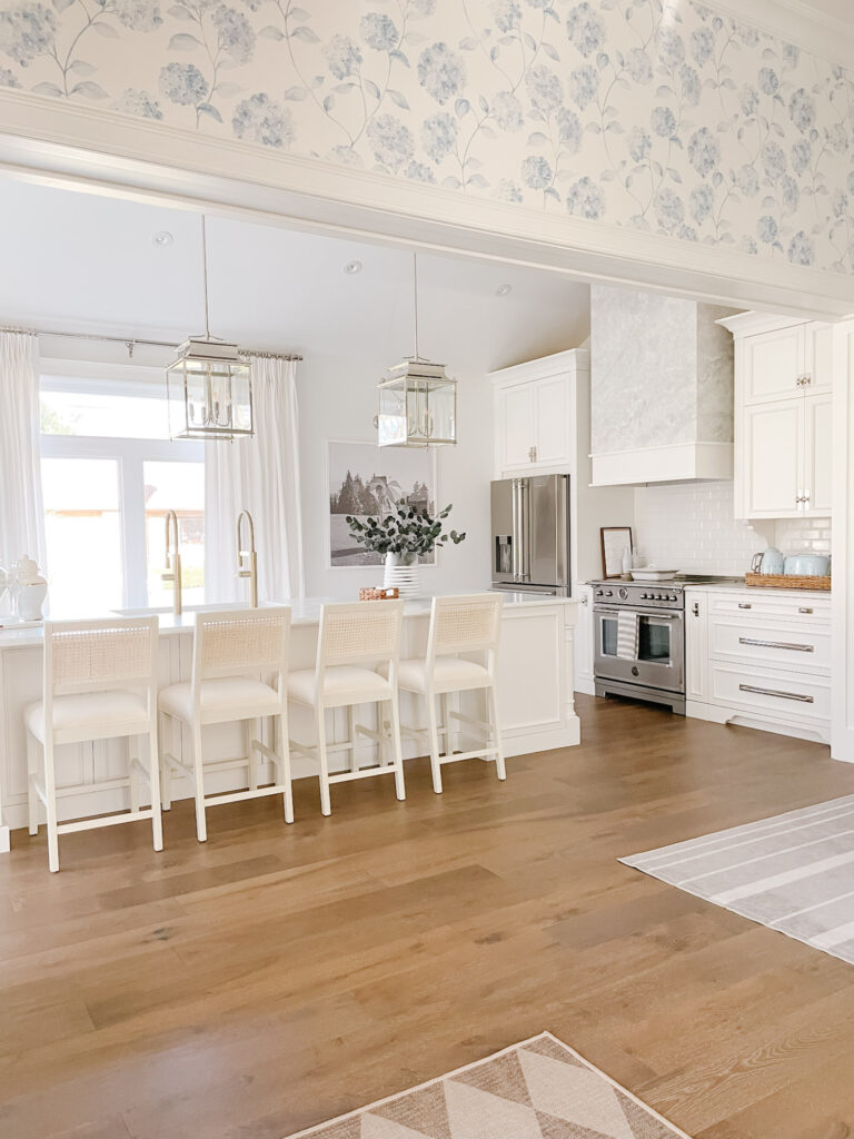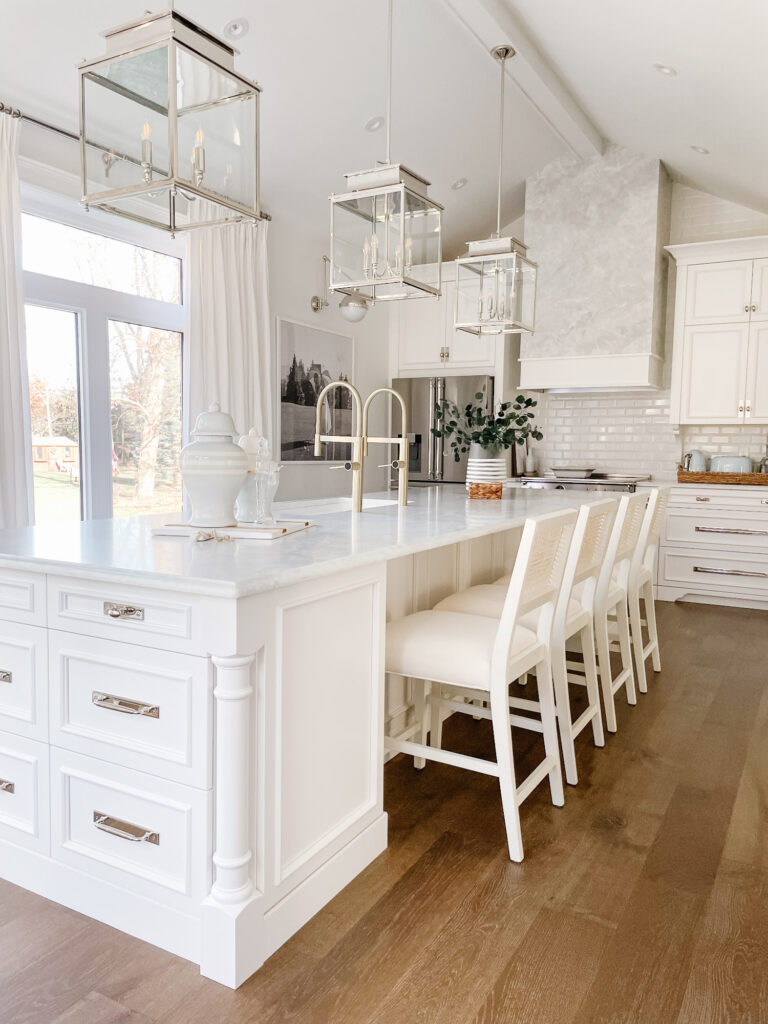 The three polished nickel lanterns are one of the prettiest parts of the room and something that I saw in all my favourite Hamptons-inspired white kitchens, so I had to include them! They add height, symmetry, and just enough sparkle without feeling fussy.