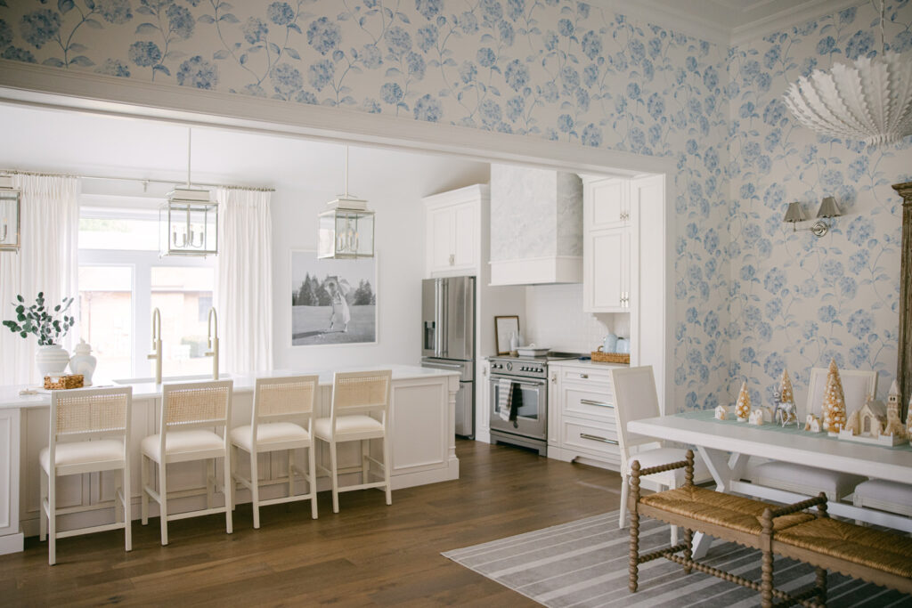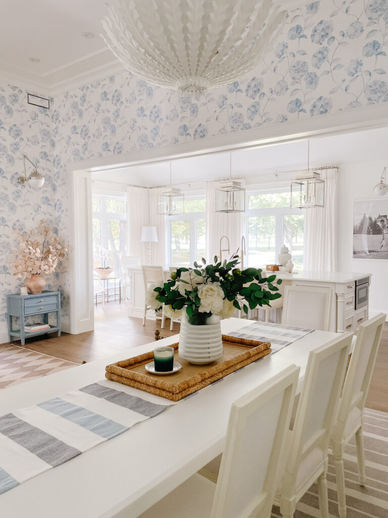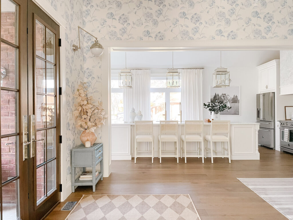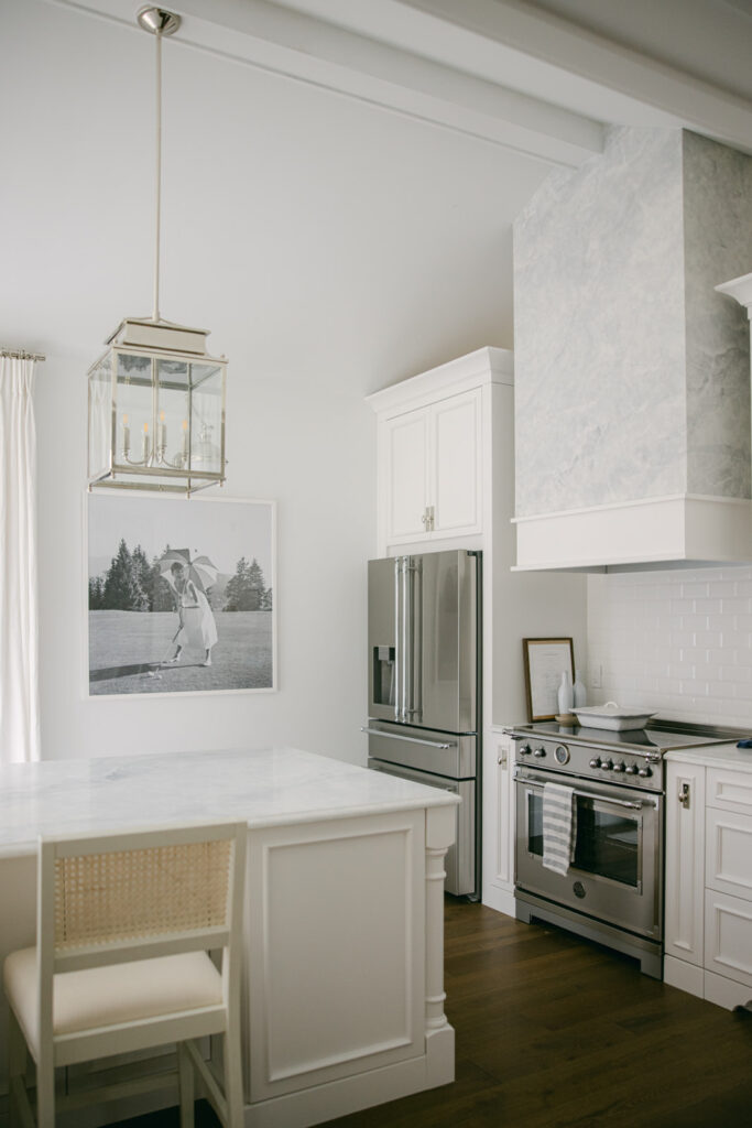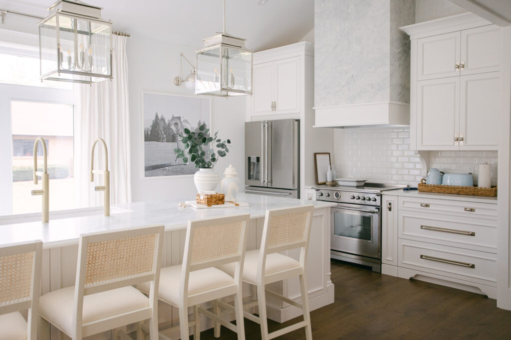 The three polished nickel lanterns are one of the prettiest parts of the room and something that I saw in all my favourite Hamptons-inspired white kitchens, so I had to include them! They add height, symmetry, and just enough sparkle without feeling fussy.