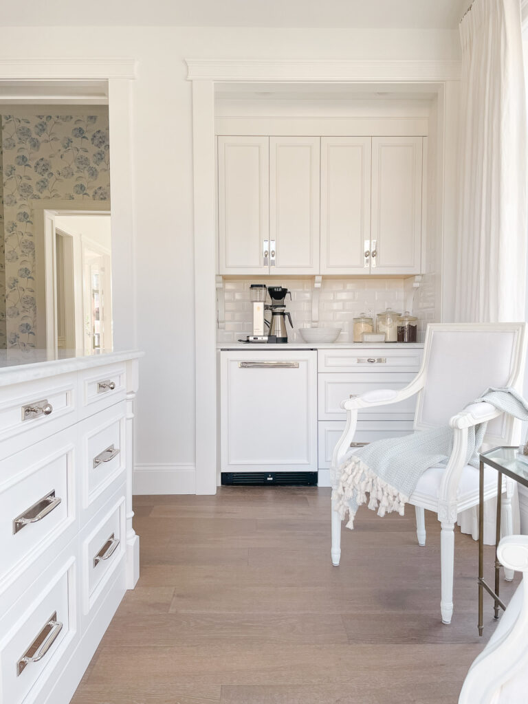 One of my favourite parts of the new layout is the coffee and smoothie bar, with a small sitting area by the front windows. I love the built in beverage fridge and that I opted for a panel instead of seeing the glass. We fill it with a million drinks and I love not see that. On the counter I keep my protein powders and coffee in jars for stylish and quick access. I use them twice a day so it’s so nice to have them right on the counter.